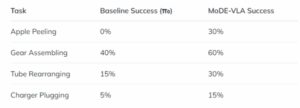 성능 테스트 결과 로봇은 사과 껍질 벗기기, 튜브 재배열, 기어 조립, 충전기 연결 등 4가지 과제에서 평균 34%의 성공률을 기록했다. 이는 기존 기반 모델 대비 두 배 이상 향상된 수치라고 회사 측은 밝혔다.